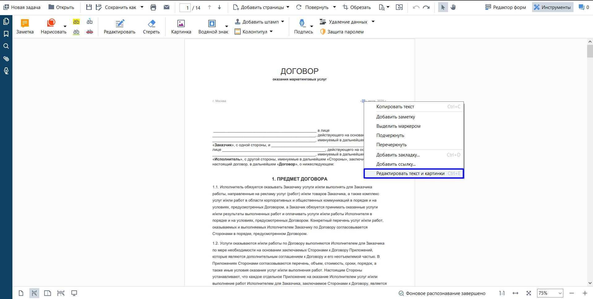 Если в готовом документе обнаружена ошибка в дате или реквизитах, функция «Редактирование текста» исправит ее прямо в PDF. Например, можно изменить название города или удалить метаданные, не нарушая структуру файла. Это особенно полезно, когда нет доступа к исходному Word.