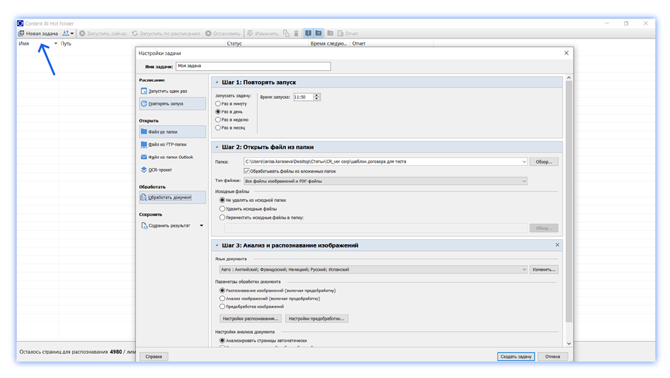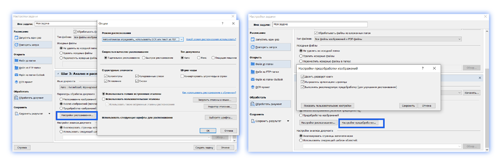 - определить пошаговый сценарий обработки. Например, указать параметры открытия и распознавания изображения и место, куда программа будет сохранять результаты работы.