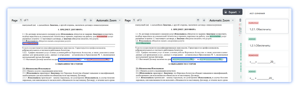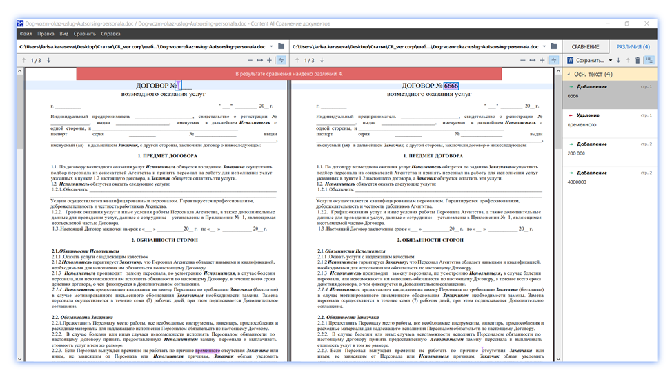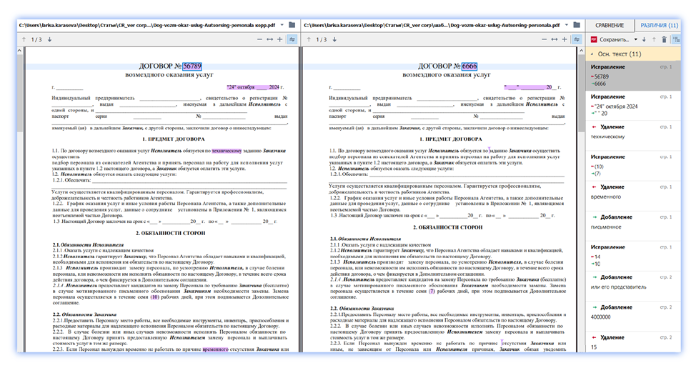 Один из наиболее распространенных сценариев применения функции сравнения ContentReader PDF Corporate, когда компания получила на подпись бумажный контракт, и нужно убедиться, что контрагент не изменил в договоре важные пункты. Это необходимо для снижения финансовых и юридических рисков.