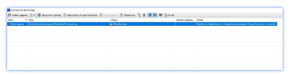 Hot Folder отображает в стартовом окне все созданные задачи. Для каждой из них система указывает полный путь к обрабатываемой папке, текущий статус и время следующего сеанса обработки.