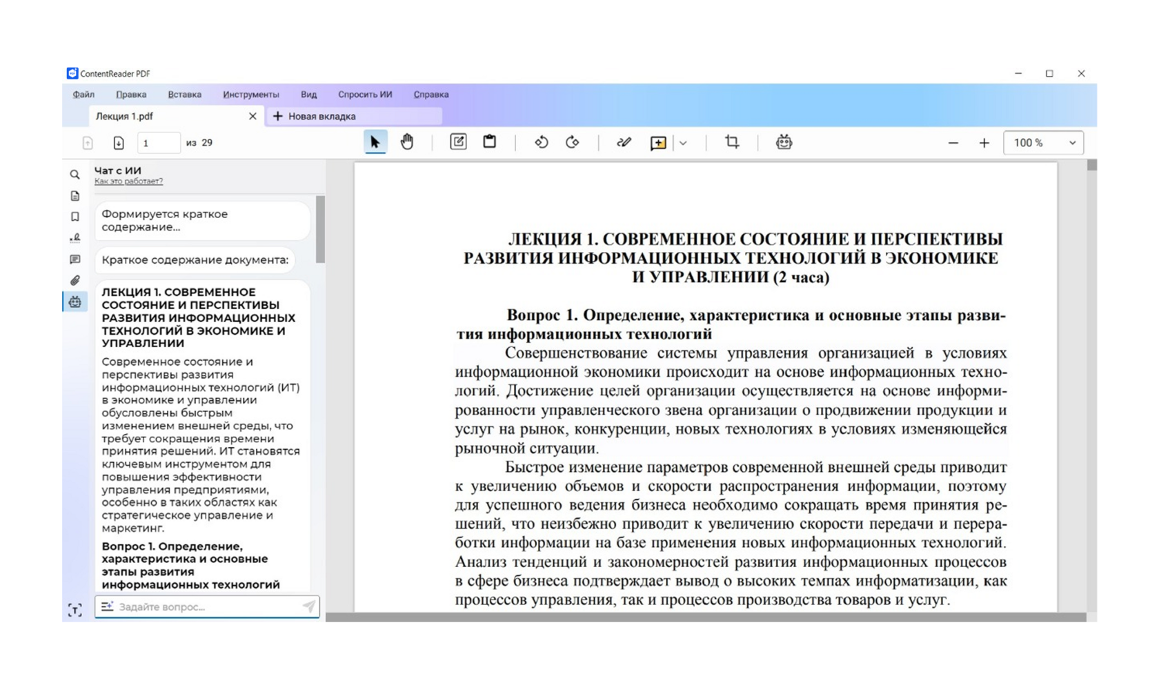Главное инновационное отличие ContentReader PDF 16 — внедрение ИИ-ассистента, который помогает пользователю находить нужные данные и обобщать информацию. Функциональность доступна в версии для организаций.